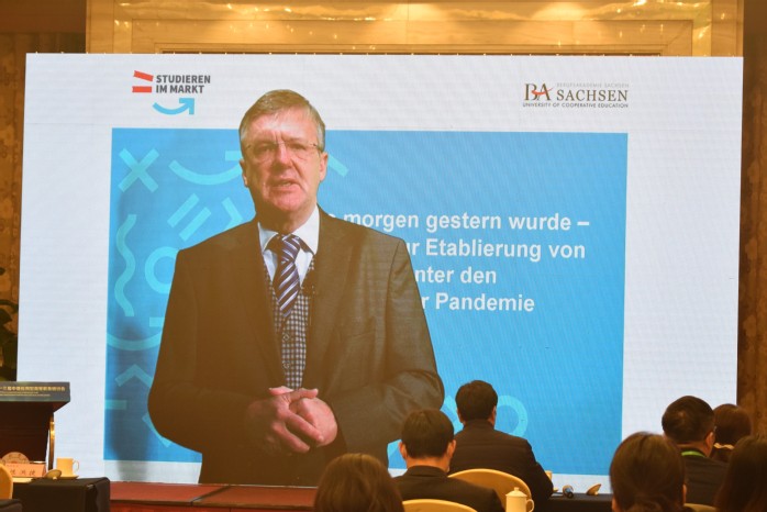 安德烈亚斯·汉塞尔以《明天如何成为昨天:关于疫情下建立在线学习的报告》为题作了报告。他从萨克森州涉及高校的战略性文件、高等教育的目标设置等方面介绍了疫情前德国高等教育的情况和德国应用型大学在疫情期间线上教学的研究与实践,并针对在实践中遇到的问题提出了许多有建设性的意见和具体的举措。他认为,线下教学、辅以线上,将是未来发展的方向。