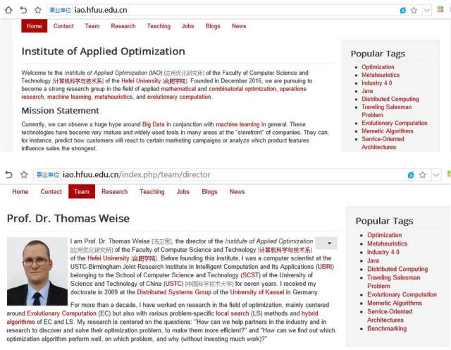 汤卫思(Tomas Weise)教授,于德国完成博士学业后,先后七年在中国高校完成博士后及副教授岗位工作,在计算机数据处理及方案优化领域,研究能力强劲,先后在国际知名权威学术杂志发表多篇具有影响力的文章,并参与和执行有多项中国国家自然科学基金等项目。汤卫思教授目前被引进我校,于我校计算机科学与技术系牵头成立“应用优化研究所(IAO)”,迅速开展启动多项研究工作。此外,他还利用个人学术领域影响力,广泛宣传我校中德教育合作示范基地,为我校引进更多国际化高层次人才。
