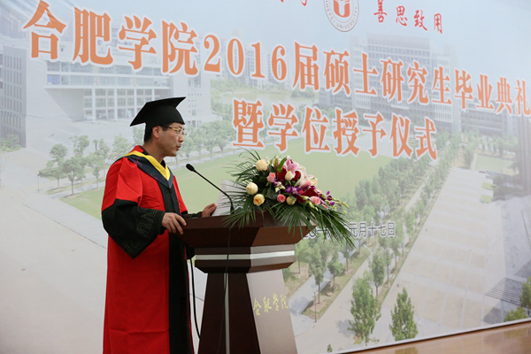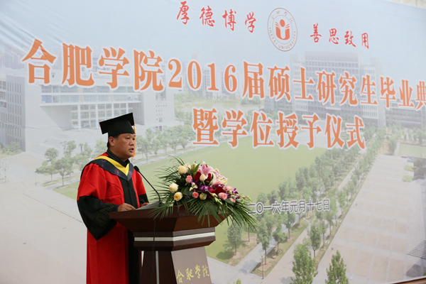 毕业典礼在庄严的国歌声中开始。合肥学院硕士研究生学位评定委员会委员、校党委副书记丁明教授首先宣读了合肥学院硕士研究生学位评定委员会“关于授予2016届环境工程专业徐芳丽等29名研究生工程硕士学位的决定”和 “关于表彰合肥学院2016届环境工程专业硕士研究生科研成果奖、优秀毕业生、优秀毕业论文和‘合大环保奖学金’获得者的决定”。