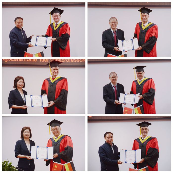 谢超、王其东、吴春梅为葛皖镝博士等六位客座教授颁发证书。